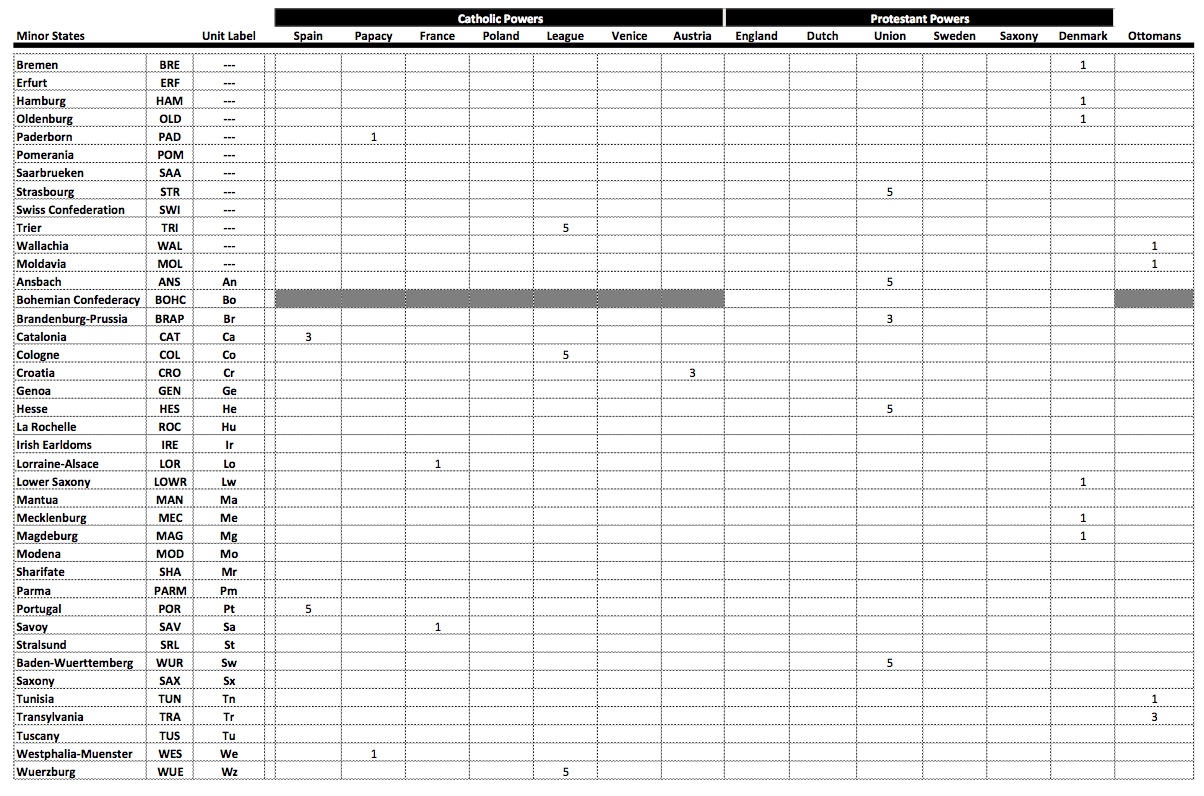 10 PLAYERS: Modify the Papacy, Saxony, Savoy, and Venice as described above. The Catholic League is removed as a playable power. Convert Bavaria into an independent minor state. Keep Bavarian home center value at 3. Only Catholic powers will be allowed to deposit INFs to Bavaria. Austria begins with 3 INFs in Bavaria and 1 INF in Saxony. The Protestant Union begins with 3 INFs in Bohemia, and 1 INF in Saxony. The Protestant Union and Austria cannot form an alliance during the game.