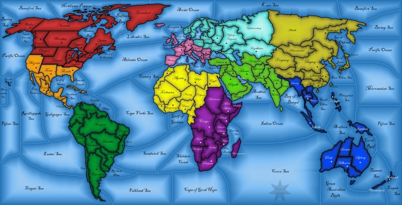 This version of the map left me with two things I wanted to address: first, Europe needed to be spread out a little more and second: Oceania needed to be more compact. What I've attempted to do with version 1.2 is put Europe in a little more powerful of a position by giving it more options of who to work with and direction to go. That meant shifting things around between Europe, Russia and Persia to try to keep the maritime balance that I've had all along. Meanwhile, attacking Oceania has always been a futile endeavor, because with so many spread out centres, it takes many units and lots of time with little reward. So, I consolidated his centres a bit to try to make it a more attractive target.